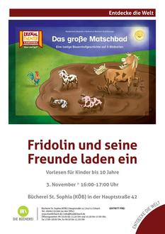 Erbach. Fridolin und seine Freunde laden ein zur Vorlesestunde in die Bücherei. Für Kindergartenkinder und Kinder bis 8 Jahre gibt es schöne Geschichten und das Kamishibai-Vorlesetheater "Das große Matschbad"". Die Stunde beginnt am 3. November um 16:00 Uhr in der Bücherei St. Sophia in der Erbacher Hauptstraße 42. Die Teilnahme ist kostenlos. Mehr dazu im Internet bei www.KoebErbach.de