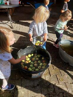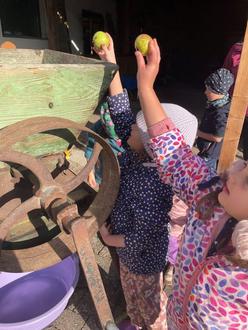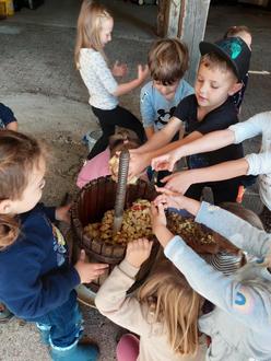 Aber wie macht man nun aus Äpfeln Apfelsaft? Einige Kinder wussten, dass die Äpfel erst einmal gewaschen werden müssen und danach in einen Häcksler kommen. Da der Häcksler nicht elektrisch funktioniert, mussten die Kinder selbst kurbeln, wozu die Kinder viel Kraft brauchten. Als die ersten Äpfel klein gehäckselt waren, kamen die Stücke in eine Kelterpresse. Auch hier war wieder die Kraft der Kinder gefragt. Durch das gemeinsame Drehen der Spindel, wurde der Saft aus den Äpfeln gepresst. Nach und nach wurde der Saft immer mehr. Der ganze Saft wurde in einem kleinen Fass gesammelt. Natürlich durften alle den Saft auch probieren. Er schmeckte sehr süß und lecker! Zum Schluss kam so viel Saft zusammen, dass jedes Kind eine Flasche für zu Hause mitnehmen konnte.