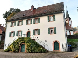 Das Güttersbacher Pfarrhaus wurde zwischen 1594 und 1597 errichtet. Es ist ein stattlicher Bau mit großer Freitreppe. Als Friedrich Meyer als Pfarrherr darin wohnte, waren die Räumlichkeiten jedoch feucht und modrig. Außerdem fühlte sich Meyer in seinem neuen Heim einsam. Im Hintergrund rechts ragt der Turm der Quellkirche hervor.