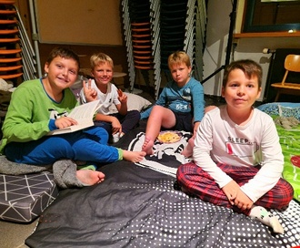 Als Abschluss des Projektes fand zu Beginn des neuen Schuljahres eine Lesenacht statt. Dazu übernachteten alle Drittklässler gemeinsam mit ihrer Klassenlehrerin Frau Manlik, der Referendarin Frau Schubert und der FSJ- Kraft Frau Bareis in der Schulaula. An diesem Abend durfte jedes Kind ein eigenes Buch mitbringen und daraus vorlesen.