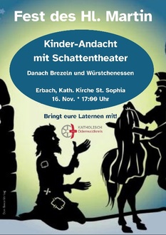Eine Kinder-Andacht zum Fest des Hl. Martin gibt es am 16. November in der Pfarrkirche St. Sophia in Erbach in der Hauptstraße. Sie beginnt um 17:00 Uhr und erzählt die Geschichte des Hl. Martin als Schattentheater. Laternen für einen kleinen Umzug sind sehr willkommen. Anschließend gibt es Brezeln und Würstchen am Feuer.