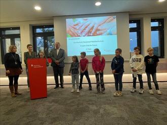 Mit den vielfältigen Aktionen wie die Pflege einer Blühwiese für Insekten oder dem Besuch von Senioren engagieren sich die Kinder der Grundschule Mossautal rund ums Jahr für eine lebenswerte Gemeinschaft, die Natur und das Mossautal. Dieser kontinuierliche Einsatz wurde nun bei einer Preisverleihung in den Räumen der Sparkasse Erbach feierlich gewürdigt. Laudator war Herr Bürgermeister Dietmar Bareis, der zum 2. Platz gratulierte, den die beiden kooperierenden Grundschulen mit ihren Programmen „Kids for future“ belegten. In einer Kurzpräsentation erläuterten Vertreteterinnen und Vertreter aus den Klassen 2-4, dass von der Verarbeitung selbstgequetschten regionalen Hafers für ein gesundes Müsli bis hin zu Müllsammelaktionen viele kleine Projekte wichtig sind für eine lebenswerte Zukunft für die nächste Generation. Die Schülerinnen und Schüler waren sichtlich stolz und erledigten ihre Aufgabe mit Bravour. Frau Nersatt und Frau Hartnagel nahmen die Urkunde und den Geldpreis stellvertretend für das Team der GSMO entgegen.