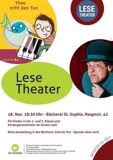Erbach. Zum bundesweiten Vorlesetag kommt das Mainzer Lesetheater am 18. November um 18:30 Uhr in die Bücherei St. Sophia in die Erbacher Hauptstraße 42. Für das Stück "Theo trifft den Ton" für Kinder im 1. und 2. Schuljahr und im Vorschulalter ist der Eintritt frei, um eine Spende wird gebeten. Die Anmeldung erfolgt in der Bücherei.