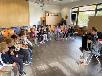 Das Highlight für die Kinder war jedoch das selbständige Musizieren und Ausprobieren, wobei vor allem die Begleitung durch Herrn Weyrauch einen riesigen Beifall verdiente. Aber auch die anderen Klassen waren euphorisiert von der musikalischen Instrumentenpräsentation, weshalb sogar die Kinder der Klasse 1 einen Tanz quer durch die Aula zum bekannten „Wellerman-Song“ für den Musiker aufführten.