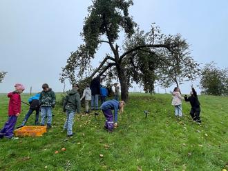 Mit viel Eifer sammelten die Kinder die reifen Früchte von den Bäumen und vom Boden auf. Es wurde geschüttelt, gerüttelt und fleißig eingesammelt- Teamarbeit war gefragt! Jede Klasse durfte dazu beitragen, dass am Ende zahlreiche Kisten mit frischen Äpfeln gefüllt waren.