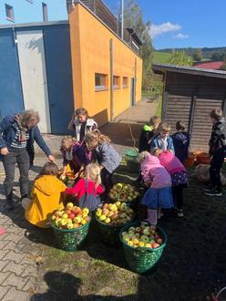 An den darauffolgenden Tagen durften die Kinder gespannt miterleben, wie aus den gesammelten Äpfeln, Apfelsaft gekeltert wurde- ein Genuss, der nach all der Arbeit doppelt so gut schmeckte.