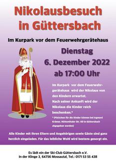 Am Dienstag, dem 6. Dezember 2022, kommt der Nikolaus nach Güttersbach. Hierzu lädt der Skiclub Güttersbach alle Kinder mit ihren Eltern und Angehörigen sowie Gäste recht herzlich ein. Für das leibliche Wohl ist auch wieder bestens gesorgt. Gegen 17:00 Uhr wird der Nikolaus diesmal am Kurpark vor dem Feuerwehrgerätehaus erwartet. Der Skiclub würde sich freuen, wenn viele Kinder, Eltern und Angehörige und Gäste am diesjährigen Nikolausbesuch teilnehmen würden.