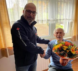 Dass sich auch Männer über eine bunte Pracht freuen können, bewies kürzlich Karl Heckmann aus Hüttenthal, der seinen dreistelligen Geburtstag feiern durfte. Da ließ es sich Manfred Leuthäußer, Teamleiter des Bereichs Hausnotruf im Roten Kreuz, nicht nehmen, den betagten Jubilar mit einem Blumenstrauß zu überraschen. Hinzu kam noch ein weiteres Jubiläum: Heckmann ist seit fünf Jahren treuer Kunde dieses Angebotes zur Sicherheit im Alltag. Geistig rege und bis vor zehn Jahren noch auf dem Rad unterwegs, freute sich der Beschenkte und frühere Schlosser über diese Geste des Hausnotrufs, denn er weiß, dass er mit dieser Technologie im Notfall auf einen verlässlichen Ansprechpartner zählen darf.