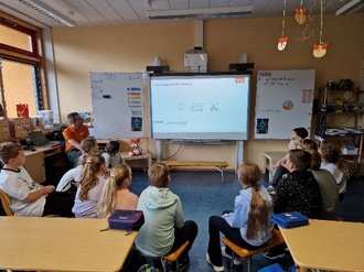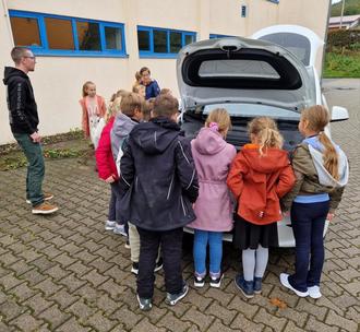 Der Tag begann mit einer interaktiven Einführung in die E-Mobilität. Gemeinsam mit Herrn Fuchs erkundeten die Kinder, welche Funktionen nur durch Strom möglich sind und welche technischen Voraussetzungen nötig sind, damit ein E-Auto geladen und gefahren werden kann. Dabei entwickelte sich ein reger Austausch zwischen Herrn Fuchs und den neugierigen Schülerinnen und Schülern, die zahlreiche Fragen stellten.