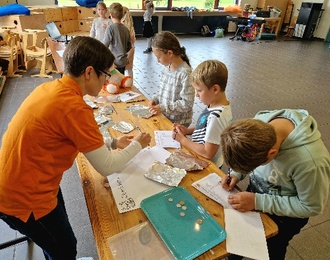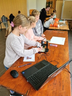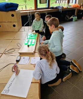 Der Höhepunkt des Vormittags fand in der Aula statt, wo verschiedene Stationen rund um das Thema aufgebaut waren. In Kleingruppen durften die Kinder experimentieren, eigene Beobachtungen machen und diese in einem kleinen „Forscherheft“ festhalten. Besonders beliebt war die Station "Heißer Draht".