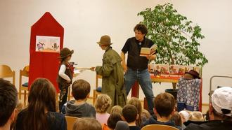 Alles drehte sich um Cowboy Klaus, den fiesen Fränk und deren Omas. "Wer lesen kann, ist klar im Vorteil" stellte Cowboy Klaus beim Lesen von Omas Brief fest. Cowboy Klaus, Fränk, die Oma, der Kaktuswald und die Tiere im Wilden Westen wurden von den Kindern gespielt. Wilde Reiter, ein Kaktuswald der nicht lachen darf und ein knisterndes Lagerfeuer brachten richtiges Cowboy-Feeling beim Mitmach-LeseTheater. Mit dem LeseTheater bietet die Bücherei zusammen mit der Hessischen Leseförderung seit über 10 Jahren Lesungen für Kinder, gewürzt mit einer kräftigen Prise Theater.
