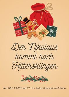 Die Feuerwehrverein Hiltersklingen lädt, gemeinsam mit der Familie Lenz und dem Ortsbeirat Hiltersklingen, zu einem gemütlichem Zusammenkommen am Café im Griene ein. Am Freitag, den 06. Dezember 2024 um 17.30 Uhr wird der Nikolaus erwartet, um die Kinder zu beschenken. Die Veranstalter würden sich freuen, wenn viele Kinder mit ihren Eltern und Angehörigen an diesem Nikolausbesuch teilnehmen würden.