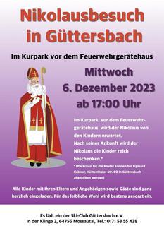 Am Mittwoch, dem 6. Dezember 2023, kommt der Nikolaus nach Güttersbach. Hierzu lädt der Skiclub Güttersbach alle Kinder mit ihren Eltern und Angehörigen sowie Gäste recht herzlich ein. Für das leibliche Wohl ist auch wieder bestens gesorgt. Gegen 17:00 Uhr wird der Nikolaus am Kurpark vor dem Feuerwehrgerätehaus erwartet. Der Skiclub würde sich freuen, wenn viele Kinder, Eltern und Angehörige und Gäste am diesjährigen Nikolausbesuch teilnehmen würden.