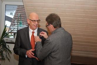 Als Teil der Auszeichnung heftet Gemeindevertretervorsitzender Kübler Harald Eisenhauer die Ehrennadel an.