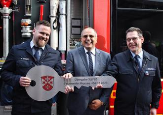 Ein überdimensionaler Schlüssel für das neue Fahrzeug wird an Wehrführer Patrick Dejmek von Bürgermeister Dietmar Bareis und Gemeindebrandinspektor Timo Münch (von links) übergeben.