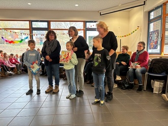 Vorgelesen wurde ungefähr 25 Minuten. Danach gab es ein Mal- und Schreibangebot für die Schulkinder. Jedes Kind malte oder schrieb etwas für die Vorleserinnen und Vorleser. Überreicht wurden die Texte und Bilder dann gebündelt in der Aula, um DANKE zu sagen, nachdem die Gruppen kurz die Texte, die sie gehört hatten, vorgestellt hatten. Manch einem Kind hat dies sicher neue Inspirationen gegeben, die präsentierten Bücher zu lesen, die teilweise auch in der Schülerbücherei vorhanden sind.