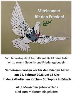 Zu einem gemeinsamen Friedensgebet sind ALLE Menschen guten Willens zum Mitbeten eingeladen. Gemeinsam wollen wir für den Frieden am 24. Februar 2023 um 18 Uhr in der katholischen Kirche in St. Sophia in Erbach, Hauptstraße 44 beten.