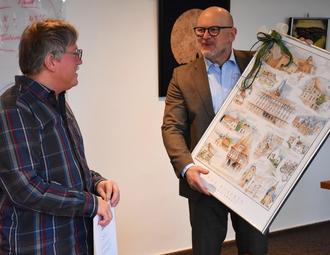 Nach über 35 Jahren bei der Bauaufsicht der Kreisverwaltung verabschiedete Landrat Frank Matiaske (rechts) Diplom-Ingenieur Dieter Kroh in den Ruhestand. Zum Abschied gab es unter anderem eine Collage des Malers Rob Roberts.
