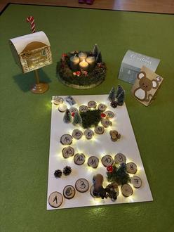 Auch in der Kindergartengruppe herrschte besinnliche Weihnachtsstimmung. Hier zog das kleine Schaf Rica ein, das sich auf die Suche nach dem Weihnachtswunder machte. Über 24 Tage hinweg begleiteten die Kinder Ricas Reise im Morgenkreis. Mit Figuren auf einem Pfad aus Holzscheiben wurden die Etappen der Geschichte täglich nachgestellt. So entstand Schritt für Schritt eine kleine Weihnachtswelt zum Anfassen. Passend dazu wuchs auch hier ein buntes Fensterbild.