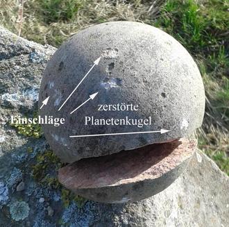 Die Planeten-Kugel war speziell aus einem gemaserten Sandsteinblock hergestellt (die Maserung steht für die Wolkenbänder und geometrische Neigung der Rotationsachse (98 Grad) des Planeten im All). Sie wurde am ersten März-Wochenende offensichtlich mit einem Feldstein mutwillig durch mehrere massive Schläge zerstört. Es ist bedauerlich, daß Unwissende wiederholt willentlich Objekte, die für die Allgemeinheit gedacht sind, unsinniger Weise beschädigen. Es wird daher bei der Polizei eine Strafanzeige gegen Unbekannt erstattet (03.03.2024/cb).