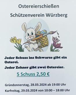 Auch in diesem Jahr findet das Ostereierschießen beim SV Würzberg wieder statt. Wir laden alle recht herzlich ein uns an den beiden Tagen im Schützenhaus zu besuchen. Für das leibliche Wohl ist bestens gesorgt!