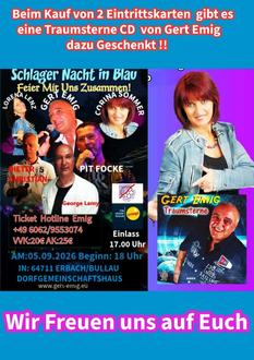 Musikalisch erwartet die Gäste ein abwechslungsreiches und hochkarätiges Programm. Mit dabei sind Lorena Lenz, Corina Sommer, Dieter Christian, Pit Focke, George Lamy sowie Gastgeber Gert Emig, der mit eigenen Titeln und seiner charmanten Moderation durch den Abend führt. Die Mischung aus gefühlvollen Balladen und mitreißenden Partyhits garantiert ein Live-Erlebnis, das lange in Erinnerung bleibt.