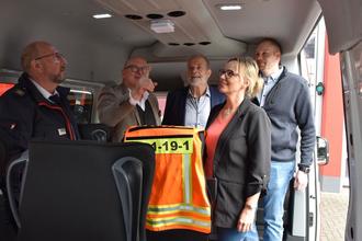 Landrat Frank Matiaske (2.v. l.) begutachtet bei einem Ortstermin einen Rauchwarnmelder mit digital gestützter Technik, der am Dach eines Mannschaftstransportwagens der Feuerwehr Erbach montiert worden ist. Über diese neuen Geräte freuen sich auch Projektleiterin Bettina Helfrich und Kreisbrandinspektor Horst Friedrich (links), Erbachs Erster Stadtrat Erwin Gieß (Mitte) und Jens Löb, zuständig für den Brand- und Katastrophenschutz der Stadt Erbach (rechts).