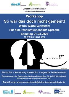 Der viel zitierte Spruch „Die schärfste Waffe ist das Wort!“ zeigt, wie verletzend Sprache sein kann. Oft sagen Menschen Worte, die andere verletzen, weil sie rassistisch oder diskriminierend sind. Dies passiert oft ganz ohne Absicht und schnell sagt man: „So war das doch nicht gemeint, ich bin doch kein Rassist!“. Die Grenzen des Sagbaren sind nicht immer eindeutig, daher beschäftigt sich der Workshop genau mit diesem Thema, um versteckten Rassismus und Diskriminierung in der Sprache besser zu verstehen. Der Workshop bietet Einblicke in die Themen Vorurteile, Rassismus und Diskriminierung. Es wird auch auf geschichtliche Zusammenhänge, Kolonialisierung und Sprache eingegangen und besonders auf die verschiedene Wahrnehmung von Sprache in Abhängigkeit der eigenen Geschichte erläutert. Es gibt genügend Raum, auch in Übungen das Gelernte zu probieren. Geleitet wird der Workshop von Gunther Fuchs und Jean-Félix Belinga Belinga. Der Workshop findet in Kooperation mit Odenwald gegen Rechts – bunt statt braun statt.