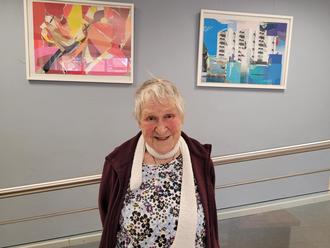 Lore Jetter-Lörcher vor zwei der Collagen, die in der Stadtbücherei Erbach bis Juni ausgestellt werden.