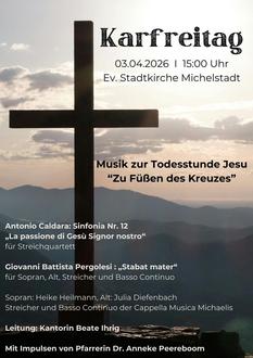 Herzliche Einladung zur Musik zur Todesstunde Jesu mit dem Titel „Zu Füßen des Kreuzes“ am Karfreitag, 3.4. um 15:00 Uhr, wenn das „Stabat Mater dolorosa“ (Die schmerzerfüllte Mutter stand am Kreuz) von Giovanni Battista Pergolesi in der Stadtkirche erklingt. „Das vollkommenste und rührendste, das je der Feder eines Musikers entflossen ist“, schwärmte Jean-Jacques Rousseau über das einleitende Duett dieses Werkes. Und tatsächlich gehört Pergolesis gesamtes „Stabat Mater“ zu den berührendsten Werken der Barockmusik. Die Trauer der Mutter Jesu unter dem Kreuz kommt auf sehr innige und auch dramatische Weise zum Ausdruck. Mit Heike Heilmann (Sopran), Julia Diefenbach (Mezzosopran), Streichern und Basso Continuo der Cappella Musica Michaelis unter der Leitung von Kantorin Beate Ihrig entfaltet das Werk seine ganze emotionale Kraft – schlicht, empfindsam und bewegend. Eröffnet wird die Karfreitagsmusik mit der Sinfonia Nr. 12 in a-Moll von Antonio Caldara: „La passione di Gesù Signor nostro“ („Die Passion unseres Herrn Jesus“). Dominik Schneider (Violine I), Rahel Zinstag (Violine II), Fernando Arrias Parra (Viola), I Chen (Cello) und Sebastian Bothe (Orgel) stimmen mit diesem Werk in die Leidensgeschichte von Jesus ein. Kurze geistliche Impulse von Pfarrerin Dr. Anneke Peereboom rahmen die musikalischen Beiträge. Der Eintritt ist frei.