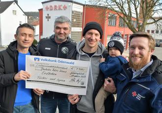 Den Betrag von 1.300 Euro haben kürzlich (v. l.) Ayhan Ari, Trainer der türkischen Mannschaft, Vitali Barleben und Tobi Hastert, Trainer der Odenwaldauswahl, in Erbach an Rettungsdienstleiter Mark Trautmann vom Roten Kreuz übergeben.