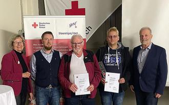 Anlässlich der Jahreshauptversammlung des Ortsvereins im Deutschen Roten Kreuz wurden für langjährige aktive Mitarbeit geehrt: Helmut Bergel für 55 Jahre (Mitte) und Daniel Lund für 10 Jahre aktive Mitarbeit. Es gratulierten Erster Stadtrat Erwin Gieß vom Magistrat der Kreisstadt Erbach (rechts), Mark Trautmann vom Kreisverband Odenwaldkreis (2. von links) und Sabine Krämer-Eis, Vorsitzende des DRK-Ortsvereins Erbach.