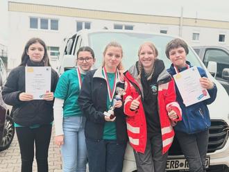 JRK-Kreiswettbewerb.jpg: Die Jugendlichen des DRK-Ortsvereins freuen sich über Medaillen, Pokal und Urkunden. Foto: © DRK Odenwaldkreis