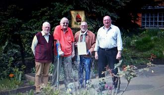 Der Odenwaldklub, besonders die Ortsgruppe Erbach-Michelstadt beglückwünscht Rolf Massek zu seiner über 70-jährigen Mitgliedschaft im OWK. Wie im Bild zu sehen überreichen ( von links nach rechts) H. Seifert, Rolf Massek, F. Doerr und G. Arnoul die Urkunde des Gesamt OWK mit den besten Grüßen an den Jubilar. Er war lange Zeit ein aktiver Wanderer und einer der Besten in der OWK Ortsgruppe Michelstadt. Zahlreiche Medaillen, Wimpel und Urkunden zeugen von seiner aktiven Wanderzeit. 70 Jahre einem Verein treu zu sein ist heute fast nicht mehr vorstellbar. Da R. Massek zunehmend auf Gehilfe angewiesen ist, bedauert er sehr nicht mehr aktiv mitwandern zu können. Trotzdem nimmt er noch immer an Vereinsveranstaltungen teil, so wie zum Beispiel jeden ersten Freitag eines Monats am Stammtisch.