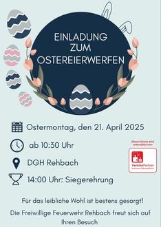 Die Freiwillige Feuerwehr Michelstadt-Rehbach lädt zum Ostereierwerfen am Ostermontag, den 21. April ab 10:30 Uhr, ein. Das Fest findet am Dorfgemeinschaftshaus in Rehbach, Schanzenweg 1 64720 Michelstadt, statt.