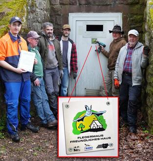 NABU Hessen, Natura 2000 und Hessischer Naturschutz verliehen kürzlich dem Vogelschutzverein Ebersberg für vorbildliche Schutzmaßnahmen die Plakette „Fledermaus Freundliches Haus“. Mit Unterstützung von NABU-Mitgliedern und einigen interessierten Bürgern hatte der rührige Verein den ehemaligen Hochbehälter auf der „Ebersberger Sommerhelle“ zu einer „Fledermaus-Villa“ umgebaut. Die Eingangstür wurde mit einem Einflugloch versehen und an der Decke und an den Wänden im Innenraum befestigten die Helfer zehn Hohlblocksteine mit Eisenklammern. Im Reservoir bilden Temperatur und Luftfeuchte ein weitgehend optimales Klima für die Kleinsäuger. Die Vogel- und Naturschützer hoffen nun, dass dieses Winter-Quartier von den Tieren angenommen wird.