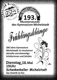 Am 16. Mai (Dienstag) findet um 19 Uhr im Schenkenkeller Michelstadt die 193. Musizierstunde des Gymnasium Michelstadt statt.