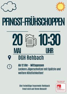 Die Freiwillige Feuerwehr Rehbach lädt zum Pfingstfrühschoppen am Pfingstmontag, den 20. Mai, ab 10:30 Uhr am und im Dorfgemeinschaftshaus in Rehbach ein.