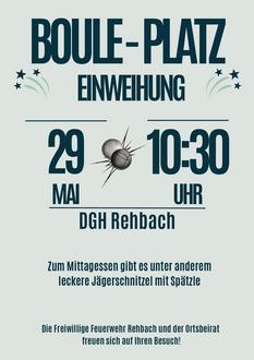 Die Freiwillige Feuerwehr Rehbach lädt am 29. Mai ab 10:30 Uhr, zur Einweihung des Boule-Platzes am Dorfgemeinschaftshaus in Rehbach ein. Für das leibliche Wohl ist bestens gesorgt.