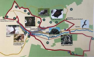 Im Rahmen dieser Feierlichkeiten findet um 11 Uhr die Enthüllung einer Schautafel zur Einweihung des neuen etwa 9km langen NABU-Erlebnispunkte-Rundwanderwegs am Dorfgemeinschaftshaus statt. Dies ist der erste NABU-Rundwanderweg seiner Art in Hessen, und wer möchte und gut zu Fuß ist, kann sich ab 11.30 Uhr mehreren geführten Wanderungen anschließen. Auf den beiden Teilabschnitten West und Ost über 4 und 5,5km wird die Strecke rund um Steinbuch erkundet und die einzelnen Erlebnispunkte näher erläutert. Die Erlebnispunkte verbinden zahlreiche der von der NABU-Gruppe seit ihrem Bestehen 1976 angelegten und gepflegten Biotope. Sie geben einen guten Einblick in die vielfältige Arbeit und das langjährige Engagement der ehrenamtlichen Vereinsmitglieder. Die einzelnen Sehenswürdigkeiten wurden samt Wegstrecke übersichtlich in einem neuen Faltblatt zusammengefasst, das an mehreren Stellen entlang des Wegs mitgenommen werden kann. Der Druckerei A. Müller GmbH in Erbach dankt die NABU-Gruppe für die freundliche Unterstützung bei der Umsetzung.