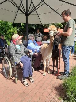 Vielen Bewohnerinnen und Bewohnern zauberten die sanftmütigen Tiere ein Lächeln ins Gesicht. „Die fassen sich so schön flauschig an und wirken fast schon beruhigend“, freute sich die 98-jährige Else Barth. Tatsächlich werden Alpakas in Europa auch in der tiergestützten Therapie eingesetzt. Nach einer Stunde, in der die an der Leine geführten Tiere viel Kontakt mit den Anwesenden hatten, war es für die Vierbeiner an der Zeit, wieder aufzubrechen in Richtung Gersprenztal.