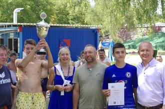 Wiesenmarkt-Beach-Cup Siegerehrung mit VCE Vorsitzendem R. Hoppmann (li), Fr. Prof. Dr. Kristina Sinemus (mitte), Dr. Peter Traub (re) und den siegreichen ukrainischen Spielern Nikita und Kiril Lavryniuk und Borys Yevlakhin