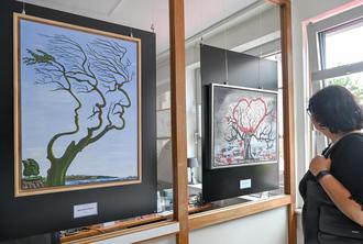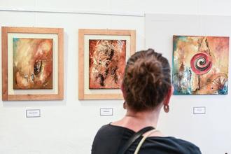 Eine Besucherin hat die Werke von Corinna Panayi-Konrad im Blick