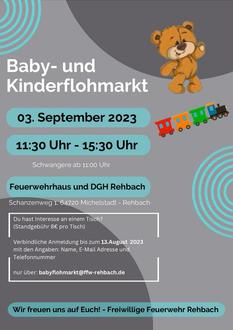Die Freiwillige Feuerwehr Rehbach lädt am Sonntag, dem 03.09, zum Baby- und Kinderflohmarkt ein. Dieser findet von 11:30 Uhr bis 15:30 Uhr statt, Schwangere haben bereits ab 11:00 Uhr die Möglichkeit den Flohmarkt zu besuchen.