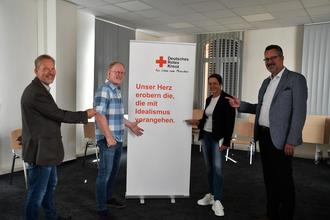 Im Schulterschluss gehen die Kreishandwerkerschaft und das Rote Kreuz mit Idealismus voran. Dies zeigen die zufriedenen Gesichter bei der kürzlich erfolgten Begehung der von der Hilfsorganisation angemieteten Räume im Haus des Handwerks. Es freuen sich von links: Harald Buschmann, Geschäftsstellenleiter der Kreishandwerkerschaft im Odenwaldkreis, Kreishandwerksmeister Martin Schlingmann sowie Sabine Münne, Assistentin des DRK-Vorstandes, sowie DRK-Vorstand Frank Sauer.