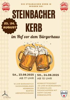 Der Carneval Club Rot Weiss Steinbach lädt mit Unterstützung der TSG Turner und dem Eventlokal La Bastille für das Wochenende 23./24. August zur traditionellen Kerb in den Bürgerhof ein.