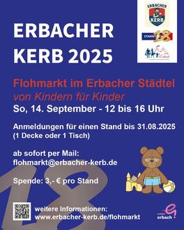 Für den Kinderflohmarkt ist eine Anmeldung erforderlich. Die teilnehmenden Familien stellen eigenständig Tische oder Decken. Die Verkaufsfläche ist begrenzt. Erlaubt sind: Kinderbekleidung (bis Größe 176), Spielsachen sowie Baby- und Kinderzubehör. Neuwaren und gewerbliche Händler sind nicht zugelassen. Die Standgebühr beträgt nur 3 Euro (als Spende für den neu gegründeten Erbacher Kerweclub). Eine frühzeitige Anmeldung per E-Mail an flohmarkt@erbacher-kerb.de ist ratsam und sollte bis spätestens 31.08.2025 erfolgen.