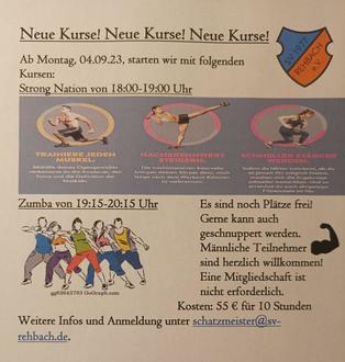 Der SV 1977 Rehbach e.V. bietet ab Montag, den 04.09.2023 im Dorfgemeinschaftshaus in Rehbach wieder neue Kurse an. Strong Nation findet von 18:00 bis 19:00 Uhr und Zumba von 19:15 bis 20:15 Uhr statt. Einige Plätze sind noch frei und es kann gern mal reingeschnuppert werden. Auch männliche Teilnehmer sind herzlich willkommen. Eine Mitgliedschaft ist nicht erforderlich. Die Kosten pro Kurs belaufen sich für Nichtmitglieder auf 55,00 € für 10 Stunden und für Mitglieder 10,00 €. Weitere Infos und Anmeldungen gerne bitte unter