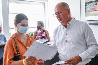 Bürgermeister Dr. Traub überreicht die Urkunde an eine glückliche Siegerin
