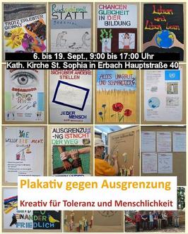 "Plakativ gegen Ausgrenzung - kreativ für Toleranz und Menschlichkeit" – Zu diesem Thema werden im Kath. Gemeindezentrum in Erbach in der Kirche St. Sophia vom 6. bis 19. September, jeweils 9:00 bis 17:00 Uhr, Plakatentwürfe und Texte ausgestellt. Sie wurden beim Kulturseminar in der Kolping-Bildungsstätte Herbstein im Vogelsberg von Erwerbslosen gestaltet.